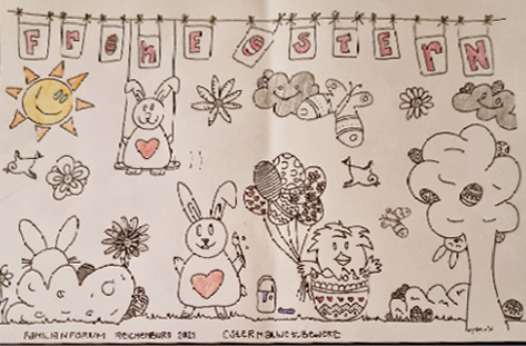 Zwei Malvorlagen können auf der Webseite des Familienforums heruntergeladen werden – eine zum Ausmalen und eine zum selber zeichnen. Alle Werke werden auf unserer Webseite ausgestellt.